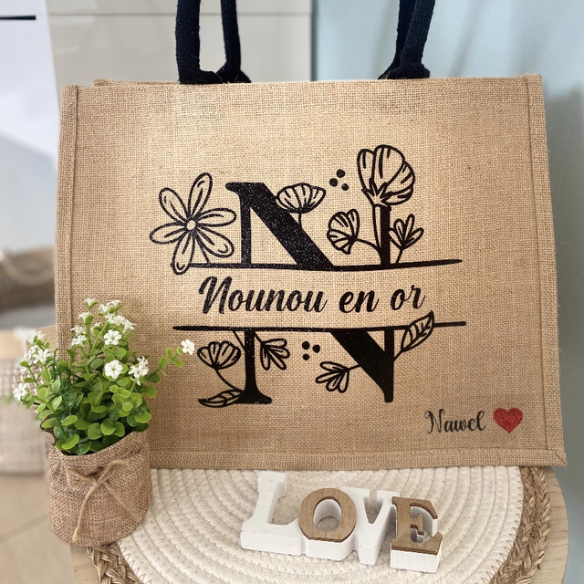 Sac en toile de jute personnalisé, avec lettre + prénom (ou autre).
